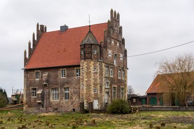The two-story manor house, built around 1520 for Heinrich von Schonebeck, features stepped gables with turrets on the north and south walls.