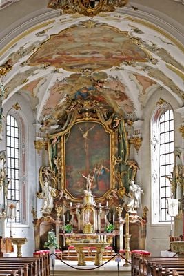 Stadtpfarrkirche St. Johann is a parish church built in the 18th century with a rectangular nave, narrow transept, and polygonal choir that define its layout. The structure sits at the northern edge of the old town, positioned adjacent to Sigmaringen Castle.