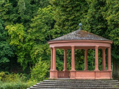 The structure reflects neoclassical architecture through its ten limestone columns and circular design, representing a traditional temple style found in German landscape gardens.