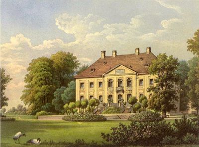 The castle grounds contain a Rococo church from 1746, which displays porcelain artworks created by Johann Joachim Kändler within its interior.
