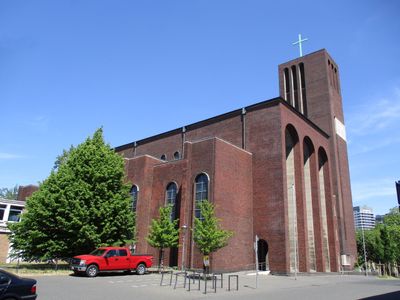 Architect Emil Fahrenkamp constructed this early modernist building between 1928 and 1929, establishing it as a significant Rhine region religious structure.