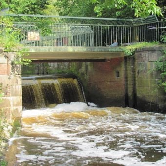 The Poppenbüttler Schleuse functions as a water level control system on the Alster River, featuring mechanical gates that regulate water flow between sections.