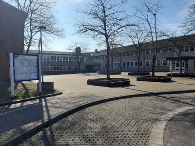 The Rhenanus-Schule combines Hauptschule, Realschule, and Gymnasium education levels within a modern building complex in Hesse.