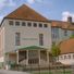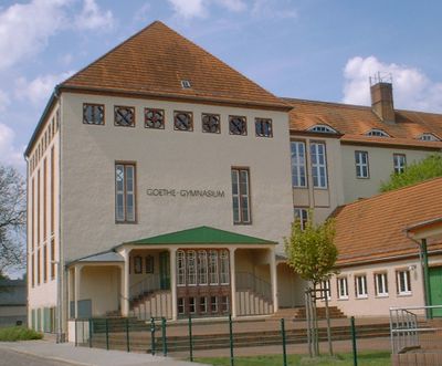 The Goethe-Gymnasium occupies a four-story building with distinctive gabled roof and bat-wing dormers, featuring decorative masonry work on its southern section.