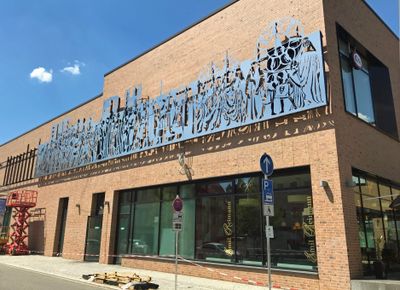 The Stauferfries extends along 60 meters of brick wall at the Remsgalerie shopping center, depicting figures and scenes in precise laser-cut stainless steel panels.