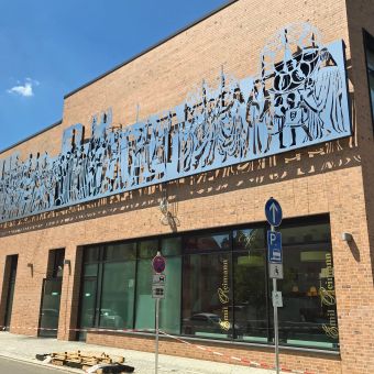 The stainless steel frieze connects three elements of local identity: Schwäbisch Gmünd as first Staufer city, metalworking tradition, and shadow theater heritage.