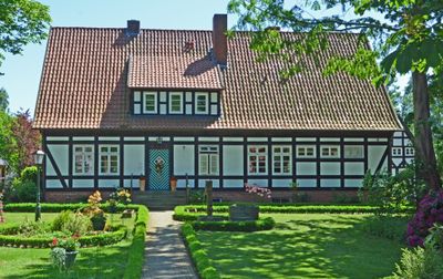 The building, protected as a historical monument, represents traditional North German architectural elements with its characteristic timber frame design.