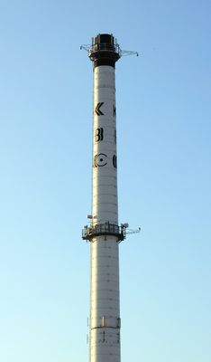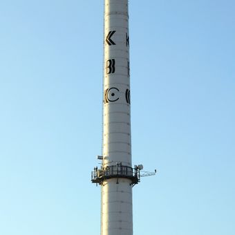 The KBC chimney stands at 85 meters tall with three metal platforms encircling its white concrete structure and black vertical KBC lettering.
