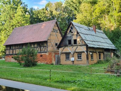 Einzeldenkmale der Sachgesamtheit Deutsches Landwirtschaftsmuseum Schloss Blankenhain: Bockwindmühle mit Müllerhaus sowie Trinkpavillon (siehe auch Sachgesamtheitsdokument Obj. 09301045) An der Windmühle -