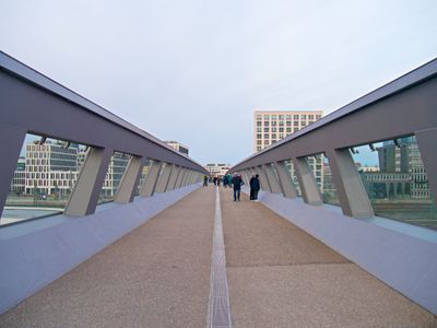 The Arnulfsteg is a pedestrian and bicycle bridge that crosses over railway tracks, connecting several Munich neighborhoods. The structure spans about 240 meters and provides an elevated pathway above the railway infrastructure.