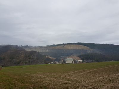 Steinbruch Werbach is an active quarry on Höhberg between Welzbach Valley and Steckenleitegraben, spanning about 7 hectares. Large stone blocks are moved by wheel loaders and then crushed into gravel of different sizes using mechanical crushers.
