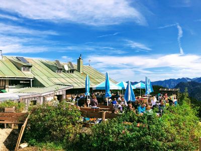 The mountain hut maintains Bavarian dining traditions by serving regional dishes, including Brotzeit platters, homemade soups, and fresh-baked cakes throughout the seasons.