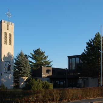 The Emmauskirche features a modern structure with a bell tower containing three bells named Faith, Love, and Hope on the western side.