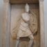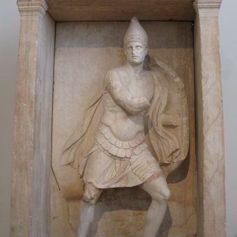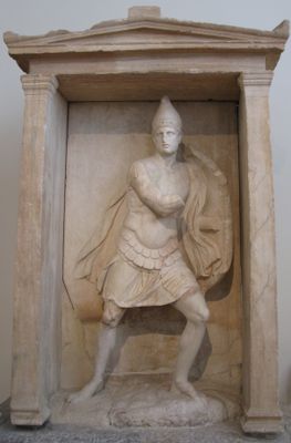 The funerary naiskos of Aristonautes presents a warrior figure in combat position, wearing a hoplite armor with a breastplate and helmet inside a temple structure.