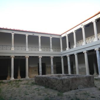 The house features an advanced water drainage system and decorated water tanks, demonstrating Roman engineering capabilities in residential architecture.