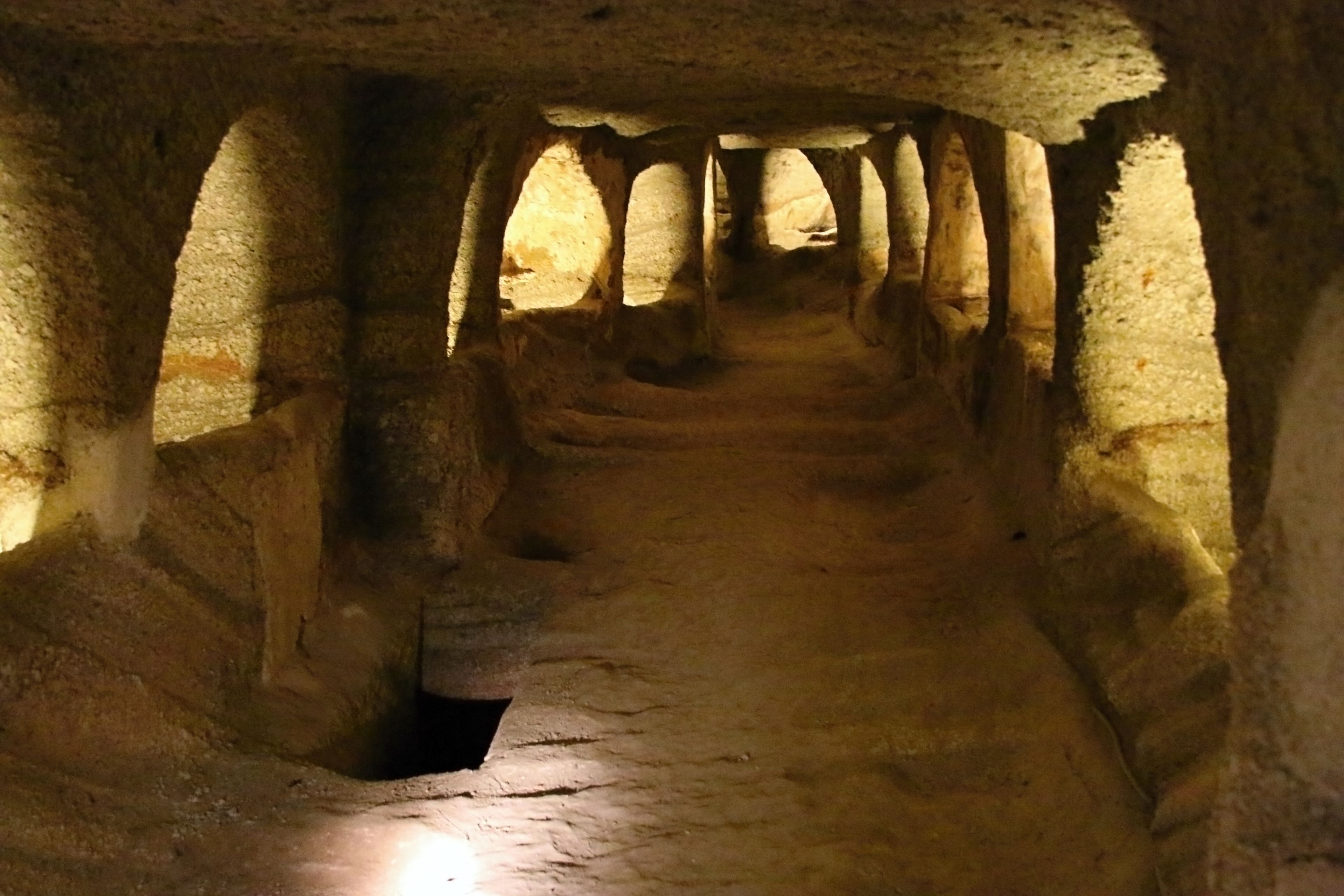 The catacombs contain three primary galleries that extend for 183 meters underground, featuring 291 tombs carved into volcanic rock.