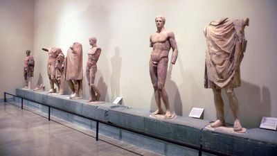 The Ex voto of Daochos consists of a long marble base that supported nine statues, eight representing family members and one depicting Apollo.