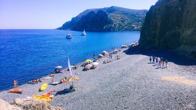 Mavra Volia, Volcanic beach in Emporios, Greece.
