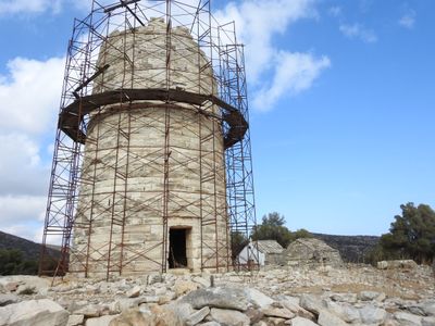 Located between Mount Zas and the sea in southeastern Naxos, the tower remains accessible through a marked path from the village of Filoti.