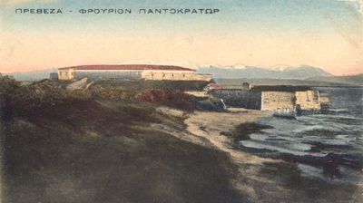 Pantokratoras Castle is a pentagon-shaped fortress positioned at the entrance to the Amvrakikos Gulf with tall surrounding walls that define its outer boundary. The interior features a central courtyard enclosed by vaulted chambers that form the core of the complex.