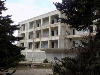 The abandoned structure stands near the road leading to Regency Casino Mont Parnes, making it accessible for visitors interested in historical architecture.
