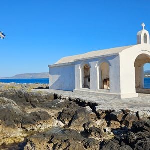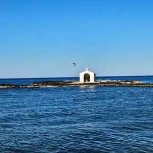 The Chapelle Saint-Nicolas de Georgioúpoli is a small stone chapel standing on a tiny rocky islet connected to the shore near Georgioúpoli, Crete, by a narrow stone path. It has whitewashed walls, a simple bell tower, and a modest interior with a small altar and icons on the walls.