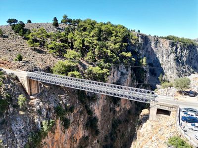 The metal bridge spans 138 meters above the Aradena Gorge, connecting the mountain village of Aradena with Agios Ioannis in Crete.