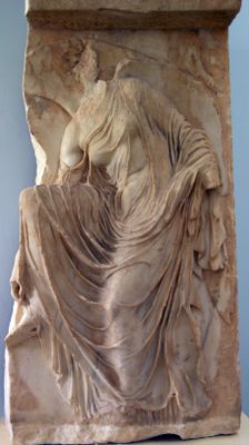 The relief shows an experimental approach to movement, presenting Nike in an unstable position that breaks from traditional static sculptural poses.