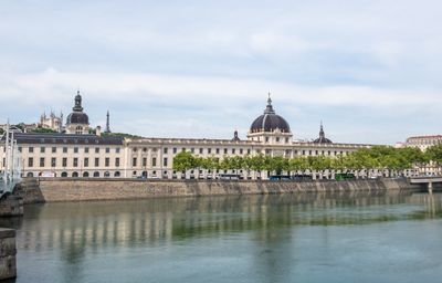 The Hôtel-Dieu extends along the Rhône River with a 375-meter neoclassical façade designed by architect Jacques-Germain Soufflot in the 18th century.