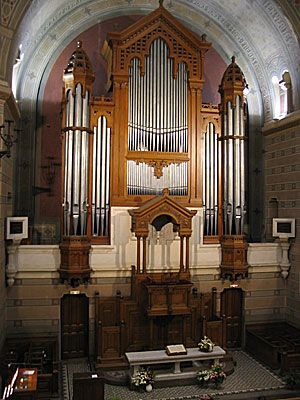 The temple's pipe organ, built by Merklin in 1884 and reconstructed in 1923, incorporates a mechano-pneumatic transmission system with two control consoles.
