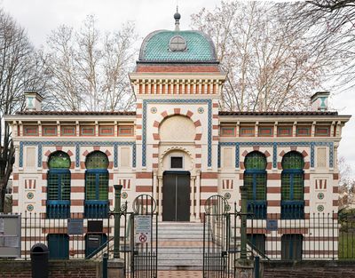 The building combines Italian Renaissance and Moorish architectural elements, featuring a specialist library and a screening room for cultural programs.