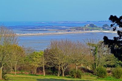 The town extends along the English Channel coast, featuring a medieval cathedral and the Kreisker Chapel with its 77-meter-tall stone spire.