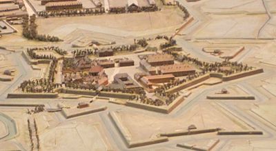 The pentagonal fortress stands with five bastions and two main gates, incorporating defense elements designed according to Vauban's first fortification system.