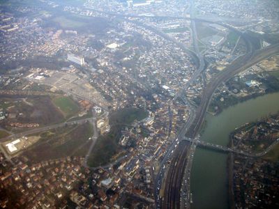 Villeneuve-Saint-Georges is a town in Val-de-Marne department, roughly 15 kilometers southeast of Paris, where the Yerres flows into the Seine. The town shows flat riverside areas along the water and higher plateaus farther from the banks.