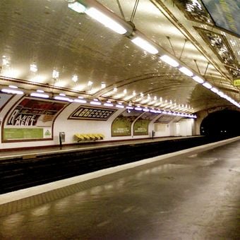 Abbesses is a metro station in Montmartre in the 18th arrondissement of Paris. Its entrance showcases glass canopy elements and wrought iron details, with platforms situated deep underground.