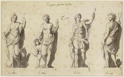 The sculptures portray allegories of four elements, seasons, hours of day, and Apollo with Muses, reflecting cosmic perceptions of seventeenth-century France.