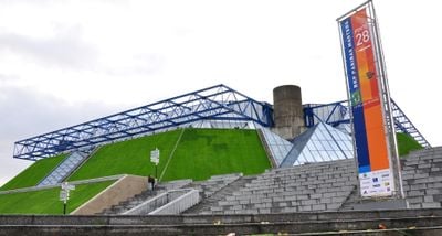 Four massive concrete pillars support the metal roof and allow clear sightlines from every angle of the seating tiers without obstructing columns in the viewing area. This construction method was a technical innovation for halls of this size in Europe at the time of opening.