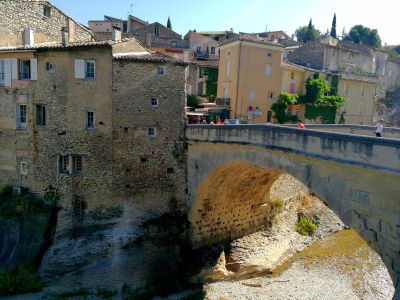 A Roman bridge over the Ouvèze has carried traffic since the first century AD and survived severe flooding. The climb to the upper town passes through a medieval gate that still holds its original iron-studded wooden door.