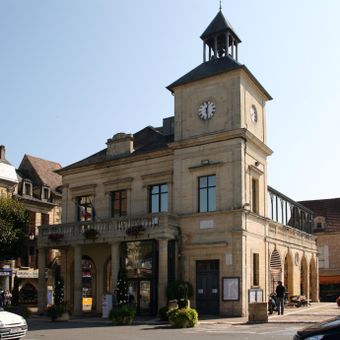 Le Bugue sits along the Vézère River with stone houses, traditional shops, and a central square featuring a clock-towered town hall. The riverside location shapes the town's character and layout.