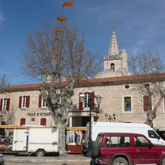 Eyragues is a commune in Provence situated between Avignon and Saint-Rémy-de-Provence on a flat agricultural plain. The village center features a town hall and a church that frame a modest square where local life unfolds.