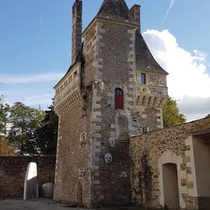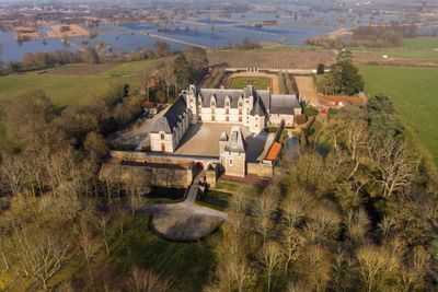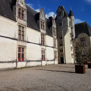 The castle incorporates both military and residential elements, featuring fortified walls, a moat, and an entrance tower built with regional Tuffeau limestone blocks.