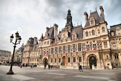 Hôtel de Ville is the city hall of Paris located in the 4th arrondissement, a large building made of pale stone with sculptural decorations on the facade and a central clock tower. The long front stretches along the square and displays numerous windows, statues of historical figures, and architectural details in the Renaissance style.