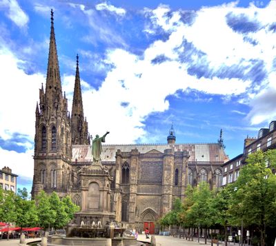 The Clermont-Ferrand Cathedral reaches 96 meters in height and stands on a hill in the old city center, constructed entirely from dark volcanic stone.