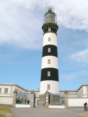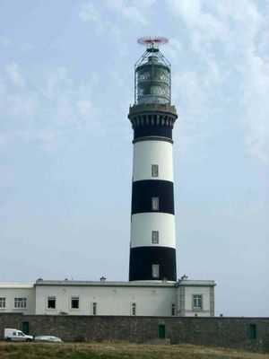 The Creach lighthouse features a cylindrical tower with white and black horizontal bands, rising 54.85 meters from a two-story keeper's residence.