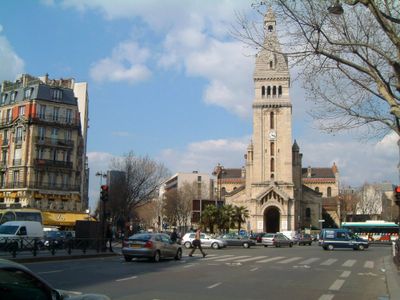 Saint-Pierre de Montrouge Church, built between 1863 and 1872, stands at 82 Avenue du General Leclerc, displaying neo-Romanesque architectural elements.