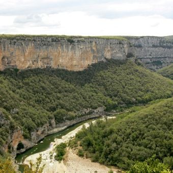 The Ardèche River carved this deep canyon through limestone rock formations over millions of years, creating natural shelters used by prehistoric humans.