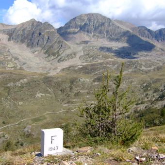 This border runs roughly 300 miles from the Alps to the Mediterranean Sea, passing through high mountain terrain and lower valleys. The line follows natural features like ridges and rivers, marked by stone pillars and signs at various crossing points.