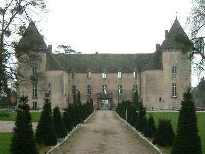 The castle extends over a 12-hectare estate crossed by a river, featuring classic medieval architecture and fortified towers with machicolation remnants.