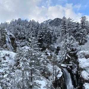 Pont d'Espagne is a stone bridge in Cauterets that crosses two mountain rivers and sits among peaks of the Pyrenees National Park. The structure connects two valleys and opens onto hiking trails that lead into the surrounding mountain landscape.