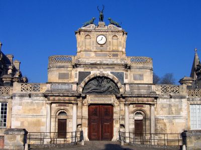 The exterior decorations include two statues of Diana the Huntress by Jean Goujon and a bronze relief by Benvenuto Cellini above the main entrance.